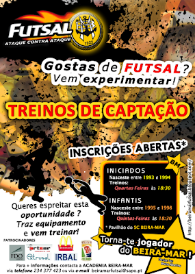 A Academia de Futsal convida todos os nascidos entre 1993-1994 (iniciados) e 1995-1998 (infantis) a virem treinar ao Pavilhão do Alboi. Os infantis treinam às Quartas-Feiras (18:30), enquanto os iniciados os treinam às Quintas-Feiras, também às 18:30. Para mais informações, contactar a Academia via telefone 234377423 ou via e-mail beiramarfutsal@sapo.pt.